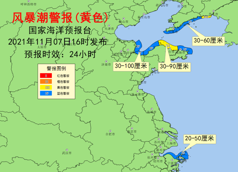 风暴潮方面,辽宁省丹东市和山东省烟台市的风暴潮预警级别为黄色,辽宁省大连市和浙江省宁波市的风暴潮预警级别为蓝色。国家海洋预报台预计,11月7日下午至8日下午,辽东半岛南岸将出现30到60厘米的风暴增水,莱州湾将出现30到100厘米的风暴增水,山东半岛北部将出现30到90厘米的风暴增水,杭州湾南岸将出现20到50厘米的风暴增水。