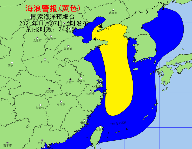 预计11月7日夜间到8日白天,渤海、黄海、东海将出现3到5.5米的大浪到巨浪区。辽宁、山东北部近岸海域将出现2.5到4米的大浪到巨浪,该近岸海域海浪预警级别为黄色;河北、天津、山东南部、江苏、上海、浙江、福建北部近岸海域将出现2到3.3米的中浪到大浪,该近岸海域海浪预警级别为蓝色。