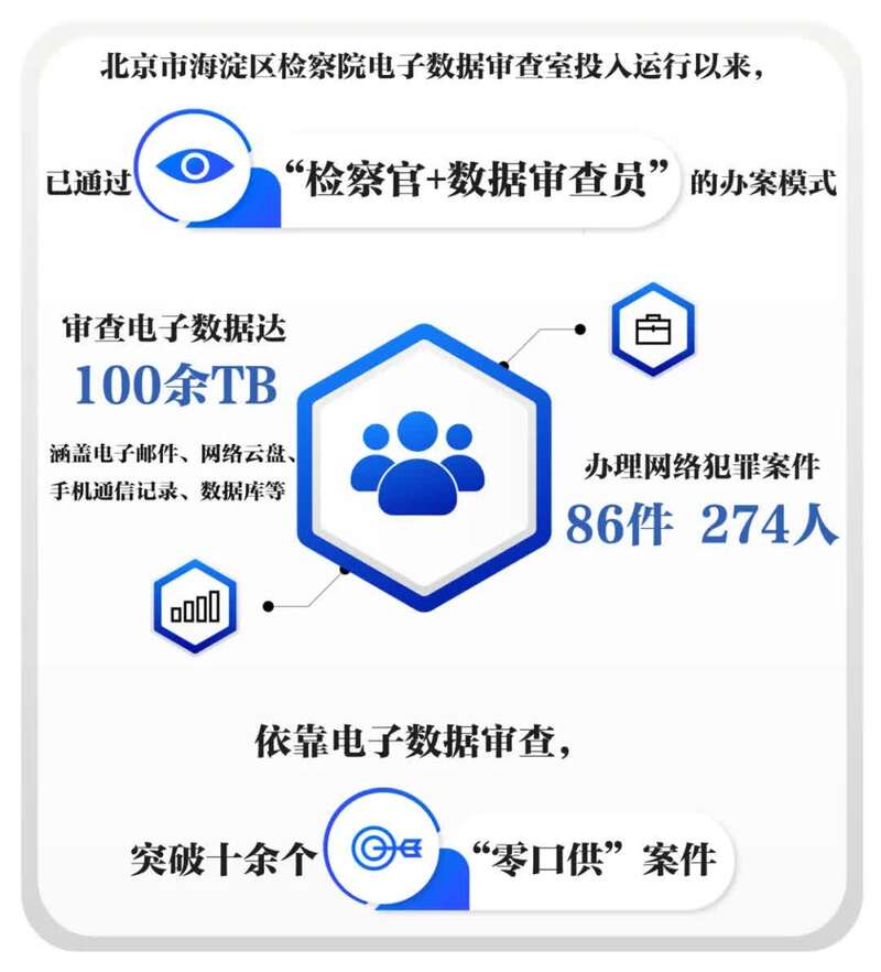 通过数据审查抽丝剥茧驳斥犯罪嫌疑人的“幽灵抗辩”,为专业鉴定机构锁定海量电子数据中的“重点鉴定范围”,从而提高鉴定精准度和效率——北京市海淀区检察院电子数据审查室正式投入运行后的3个月内,通过“检察官+数据审查员”的办案模式办理网络犯罪案件86件274人,审查电子数据达100余TB,涵盖电子邮件、网络云盘、手机通信记录、数据库等,电子数据审查能力和水平进一步提升。