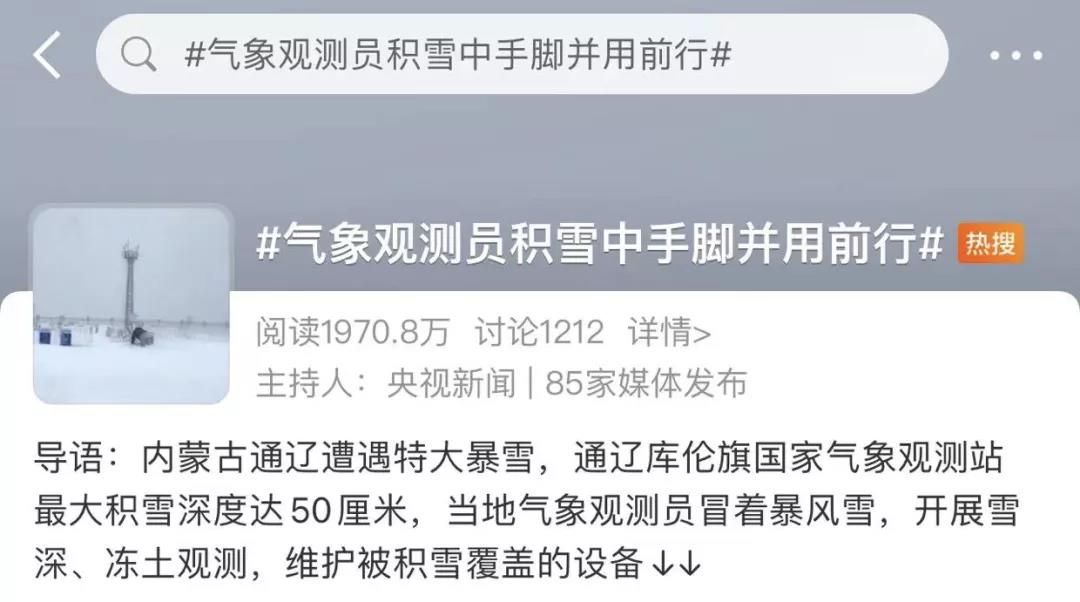 视频中,内蒙古通辽库伦旗国家气象观测站观测员冒着暴风雪,手脚并用前行,开展雪深、冻土观测,维护被积雪覆盖的设备。