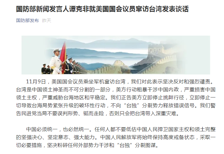 【环球时报记者 郭媛丹 张婷鸽】国防部新闻发言人谭克非9日晚发表谈话,就美国国会议员当天乘坐军机窜访台湾表示坚决反对和强烈谴责。紧接着,东部战区新闻发言人施毅陆军大校宣布,11月9日,中国人民解放军东部战区组织兵力在台海方向进行联合战备警巡,进一步检验提升多军兵种联合作战能力。台湾是中国领土一部分,战区部队组织的此次军事行动,是针对有关国家在台湾问题上严重错误言行和“台独”分裂势力活动所采取的,是维护国家主权的必要举措。美国一些人近期频繁在台湾问题上挑事。分析人士指出,中国国防部和负责台海方向的东部战区9日相继发声,在信息发布和军事行动上联动进行反制,凸显了解放军始终保持箭在弦上的战备状态,预案完备。