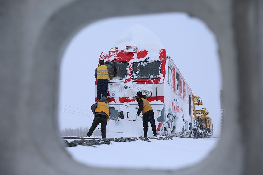 2021年11月9日,内蒙古赤峰,铁路职工抢雪保畅通,确保铁路运输畅通。