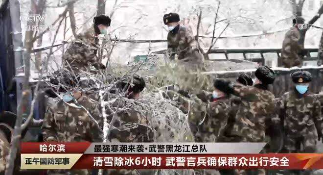 8日,黑龙江省哈尔滨市大部分地区遭遇了罕见的冻雨天气,导致道路两旁许多树木被压倒、树枝折断,严重影响人们的出行安全。武警黑龙江总队接到命令后,迅速组织600余名官兵,携带清雪器材近千套,按照实际任务进行编组,对倒伏树木和积雪进行清理。经过6个小时连续作业,官兵们完成了市区主要街道的清雪除冰任务,为来往行人开辟出了一条安全通道。