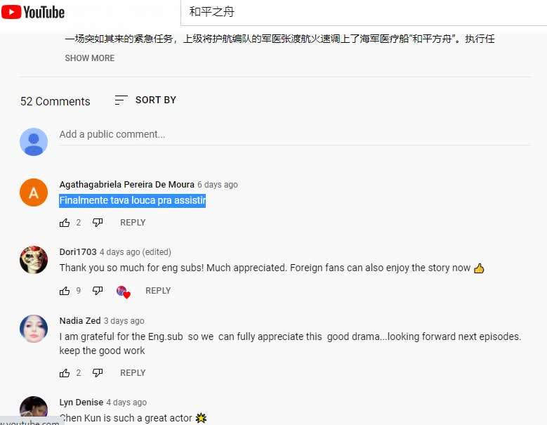 《和平方舟》在YouTube上的各国评论,比如“Finalmente tava louca assistir”为葡萄牙语“迫不及待想要看下去”