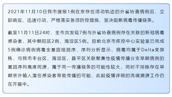 截至11月11日24时,北京全市共发现7例与外省协查病例存在关联的新冠病毒感染者,其中朝阳区2例、海淀区5例。目前北京市疾控中心实验室已完成5例确诊病例病毒全基因组测序,序列分析显示,病毒均属于Delta变异株,与北京市丰台区、海淀区、昌平区关联聚集性疫情传播分支早期病例的基因序列高度同源,属于同一传播链条的可能性较大,同时不排除存在早期京外输入潜在感染者导致传播的可能,此起疫情详细的流调溯源工作仍在开展中。