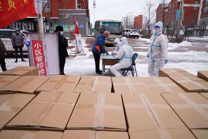 11月10日,在黑龙江省黑河市一小区,社区工作人员为居民发放免费生活物资。新华社记者王松 摄