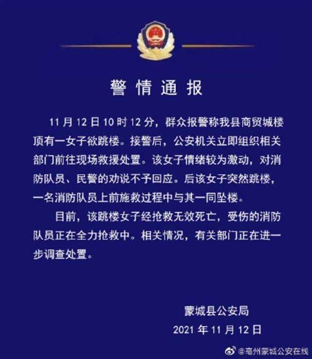 12日晚8时58分,安徽省亳州市蒙城县公安局官方微博发布通报称:11月12日10时12分,群众报警称我县商贸城楼顶有一女子欲跳楼。接警后,公安机关立即组织相关部门前往现场救援处置。该女子情绪较为激动,对消防队员、民警的劝说不予回应。后该女子突然跳楼,一名消防队员上前施救过程中与其一同坠楼。目前,该跳楼女子经抢救无效死亡,受伤的消防队员正在全力抢救中。相关情况,有关部门正在进一步调查处置。