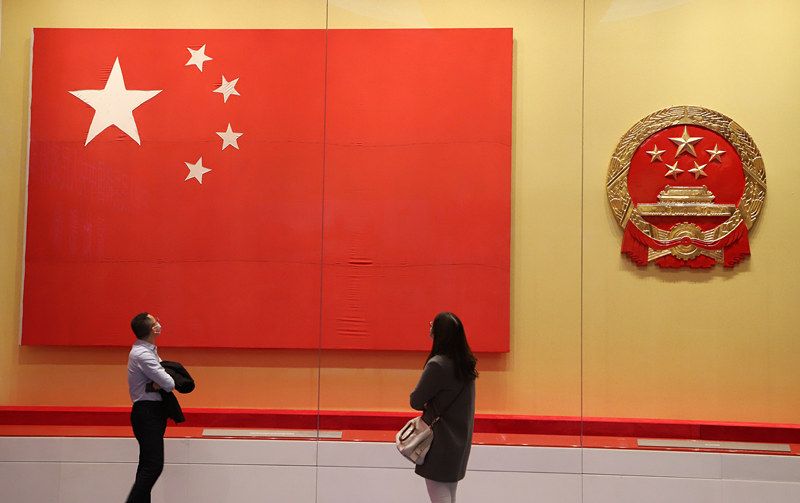 2021年11月12日,北京,观众在“‘不忘初心、牢记使命’中国共产党历史展览”上参观开国大典时升起的第一面五星红旗。