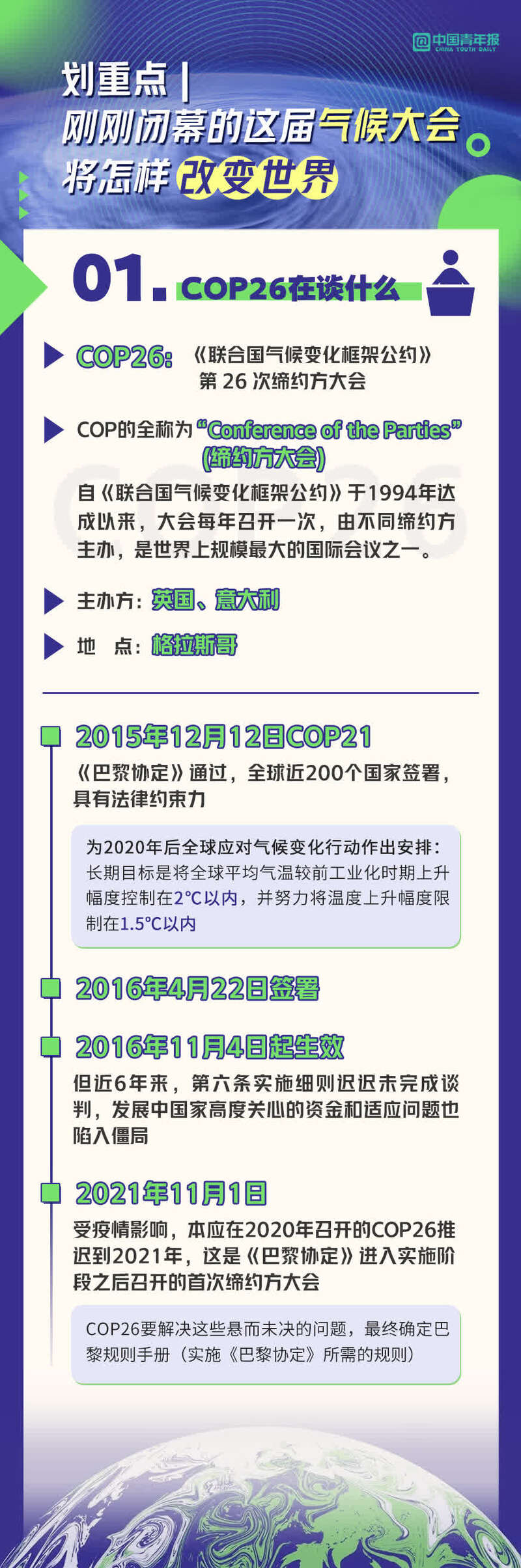 英国当地时间11月13日傍晚,联合国气候变化格拉斯哥大会在延时一天之后闭幕。经过两周紧张的谈判,近 200 个国家通过一项旨在加强气候行动的重要协议,并就《巴黎协定》实施细则等核心问题达成共识。
