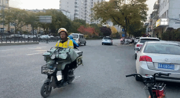 外卖员骑行电动自行车快速行驶。