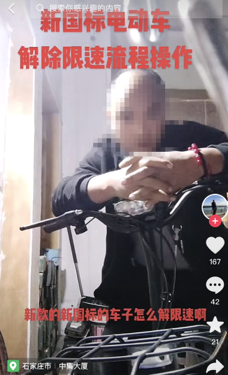 有受访者告诉记者,一些非主流品牌电动自行车,出厂直接预留改装操作空间,简单操作就能实现提速。记者也在网上找到数个相关视频,其中一段视频教程显示,将某品牌电动自行车关掉电源,随便捏刹车杆,把电门拧到底保持住,再打开电源,保持一分钟以上,限速就被解除了。