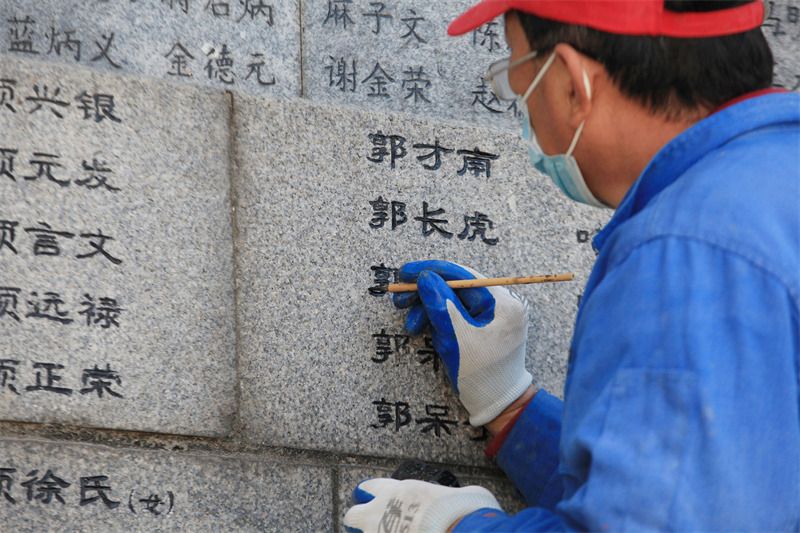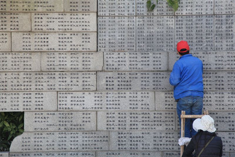 2021年11月14日,江苏省南京市,侵华日军南京大屠杀遇难同胞纪念馆,翁师傅在遇难者名单墙(“哭墙”)前为10665名遇难同胞名字依次“描红”。