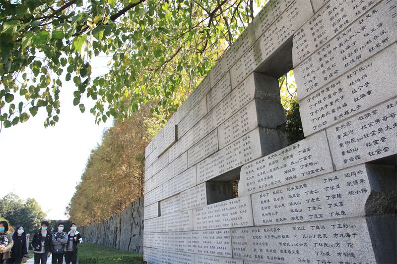 2021年11月14日,江苏省南京市,侵华日军南京大屠杀遇难同胞纪念馆,游客在遇难者名单墙(“哭墙”)前参观。