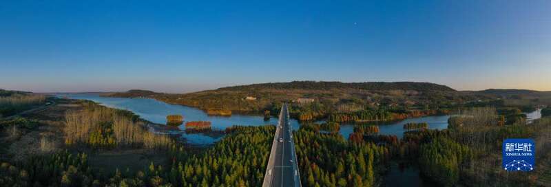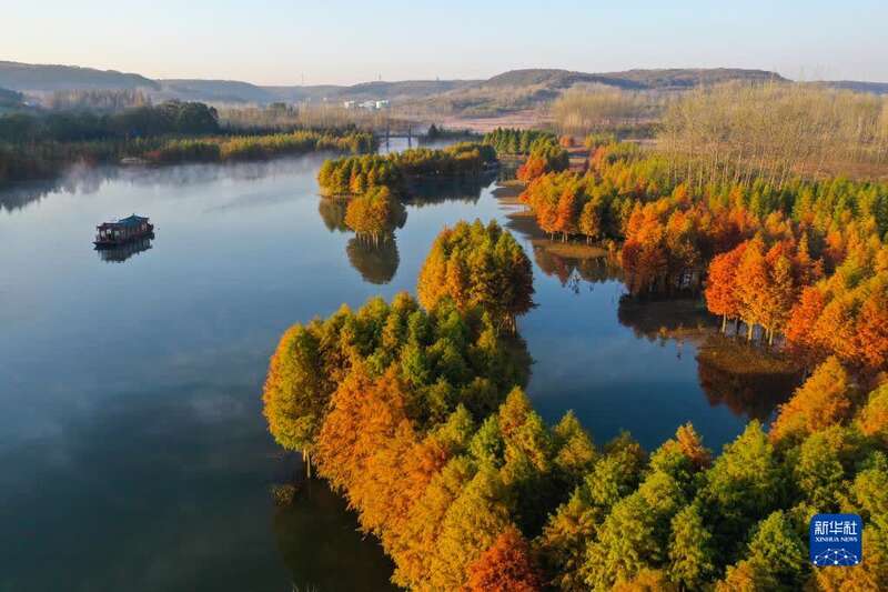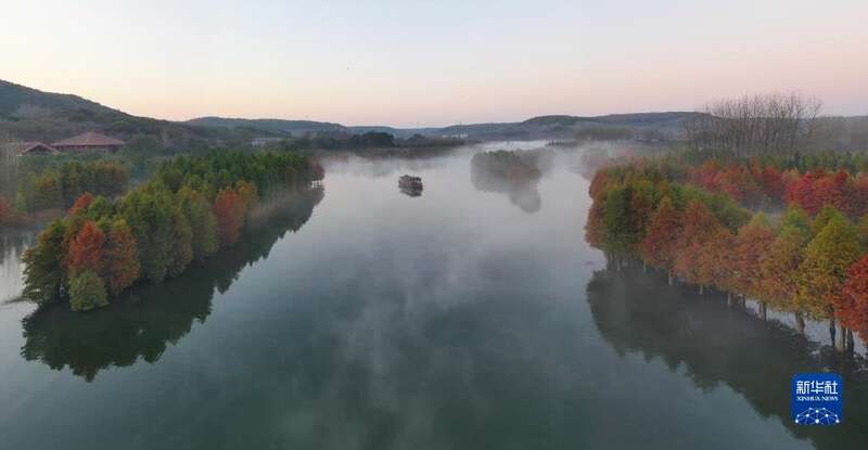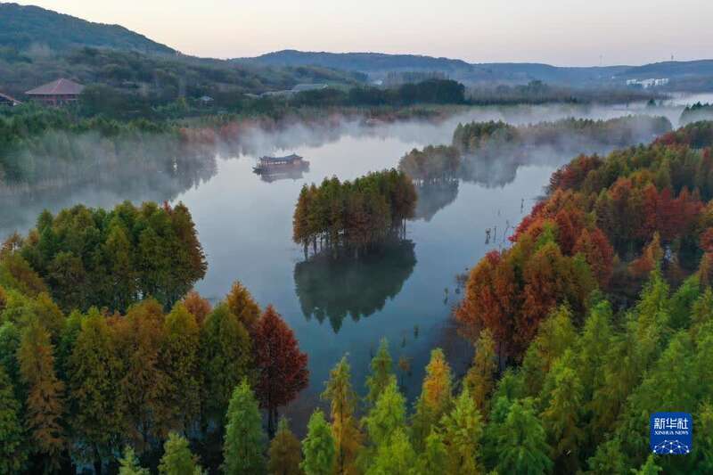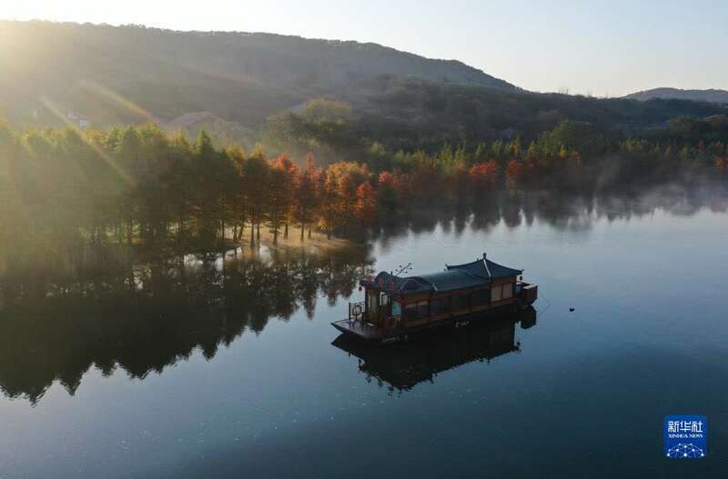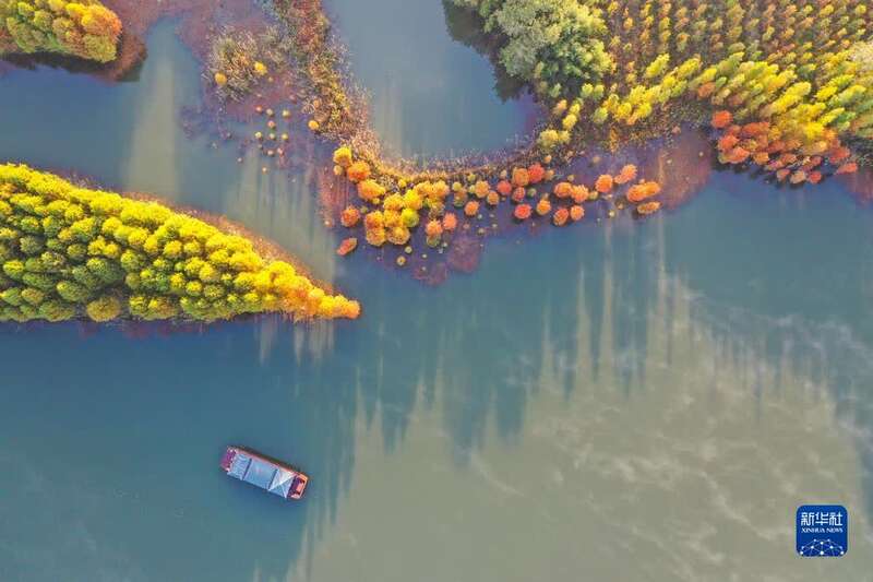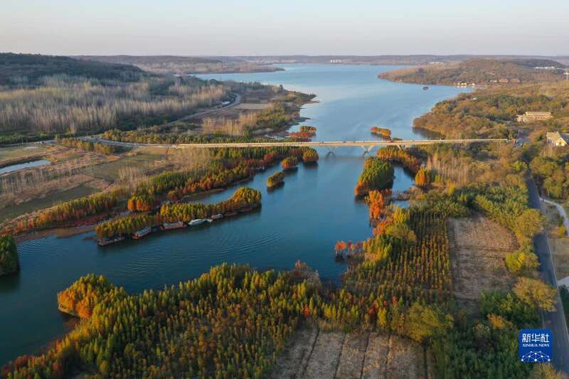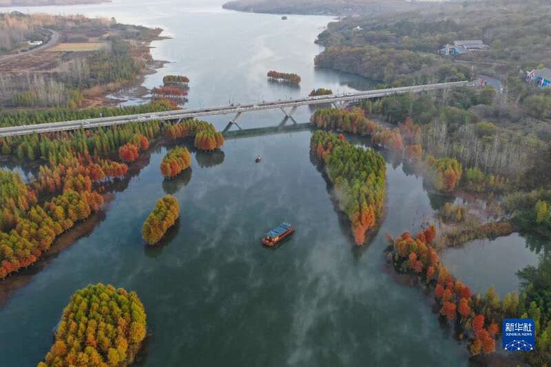 初冬时节,江苏省盱眙县天泉湖色彩斑斓,碧水与红杉相映成趣,构成一幅美丽的冬日生态画卷。