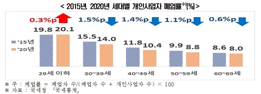 据韩国经济研究院统计,青年从事个体经营的发展状况也并不理想。截至2020年,青年个体创业者的企业倒闭率为20.1%,是整体平均水平(12.3%)的1.6倍,较2015年的19.8%上升了0.3%,是唯一一个在所有年龄段中出现恶化的。