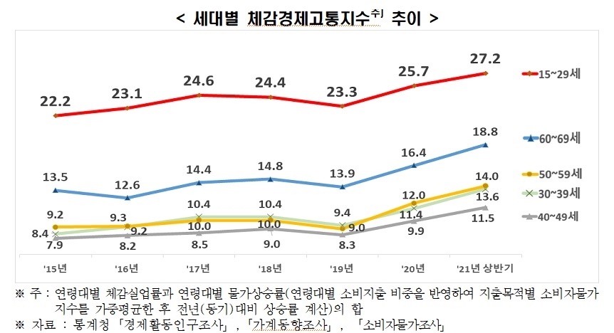 据《韩国经济日报》报道,按年龄划分的15 ~ 29岁人群的“情感经济痛苦指数”最高,为27.2,其后依次为60多岁(18.8)、50多岁(14.0)、30多岁(13.6)、40多岁(11.5)。