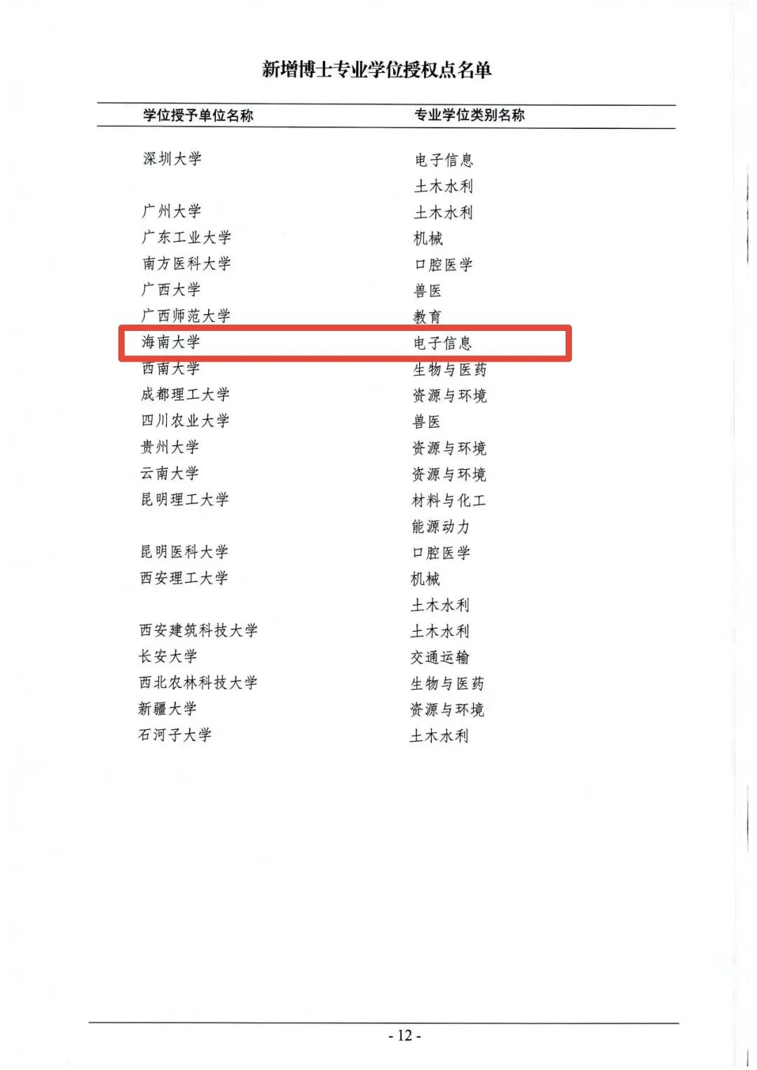 海南大学新增列4个博士学位授权点。新增博士学位授权一级学科3个,分别为马克思主义理论、土木工程、生物医学工程;新增1个电子信息博士专业学位授权点。