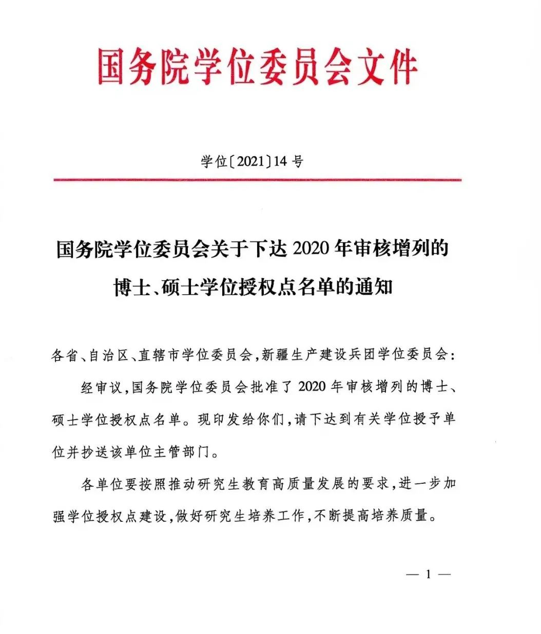 近日,国务院学位委员会印发《关于下达2020年审核增列的博士、硕士学位授权点名单的通知》。