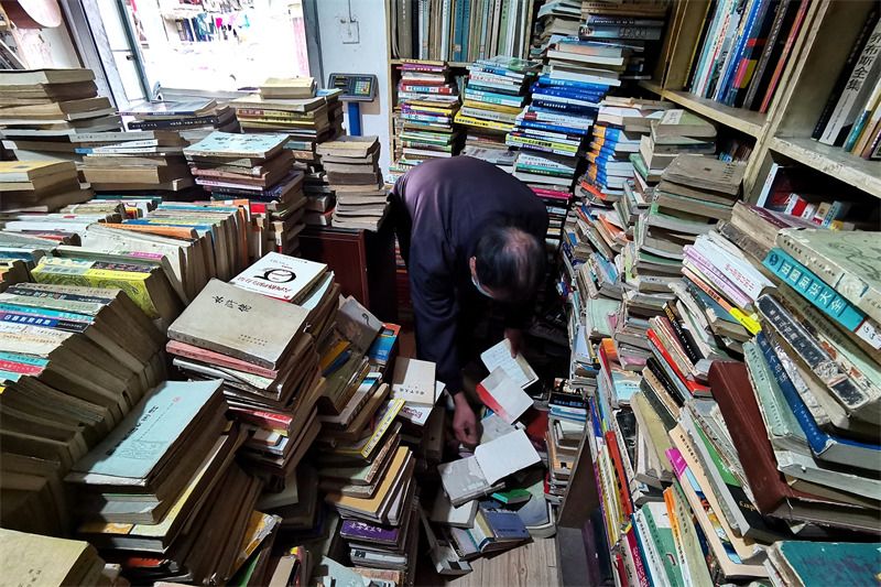 2021年11月15日,武汉上滑坡56号,市民在珍知旧书店选购书籍。在20平方米的旧书店里,四面的书柜和中间的桌子上堆满了旧书,书柜与桌子之间的通道只容一个人侧着走。