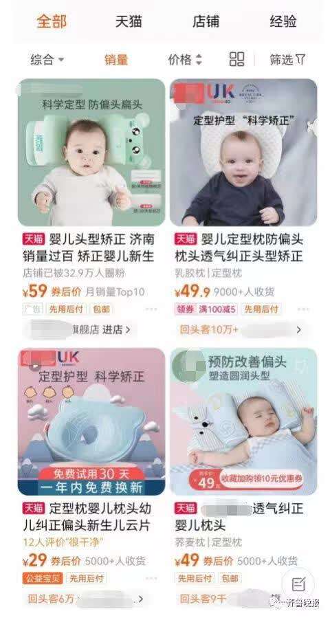 不仅价格差距大,婴儿头型定型产品的材质等也完全不同。有纯棉、海绵、记忆棉等多种,不同的种类、不同的材质,但都宣称“让孩子睡出完美头型”。不仅如此,商家的各种看似“科学”的宣传语也是五花八门,十分“唬人”。