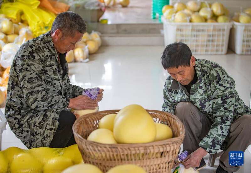 11月15日,在巫溪县蒲连镇桐元村,墩子石蜜柚种植专业合作社负责人谭周东(左)和村民谢芝灯一起打包新采摘的蜜柚。新华社记者 黄伟 摄