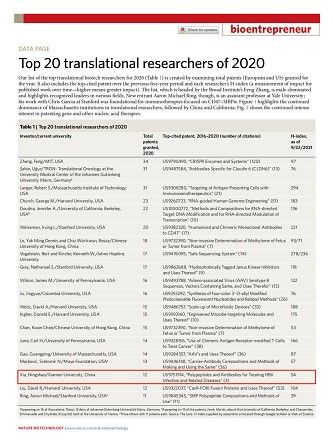 11月9日,世界权威期刊《自然·生物技术》公布“2020年度全球前20位转化研究者”。