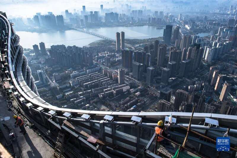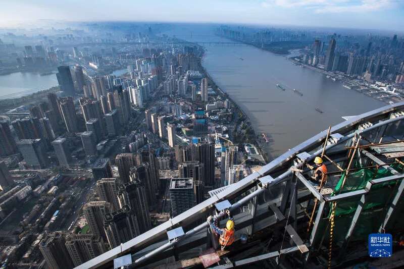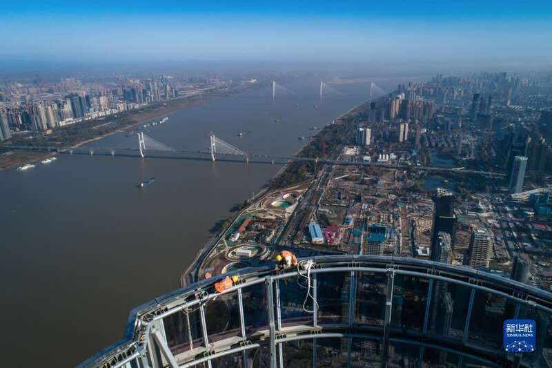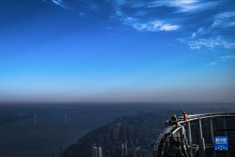 11月15日,中建三局二公司工人在武汉绿地中心项目建设现场近500米的高空施工。新华社记者 肖艺九 摄