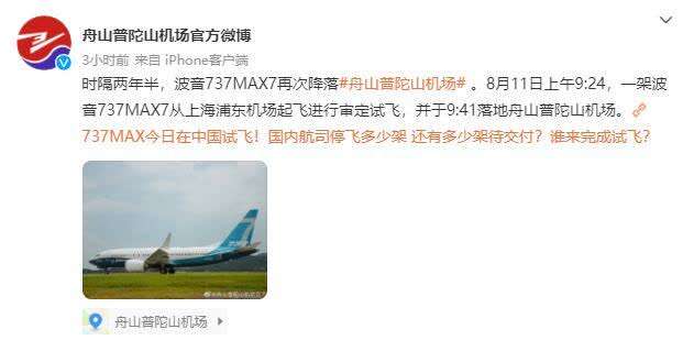 据舟山普陀山机场消息,8月11日上午9:24,波音737MAX7从上海浦东机场起飞进行审定试飞,9:41落地舟山普陀山机场,进行了近2个小时的空域与进近验证试飞,于8月11日13:06离开舟山,返回上海浦东。这是时隔两年半以来,波音737MAX再次降落舟山普陀山机场。波音方面称,此次试飞取得了成功。