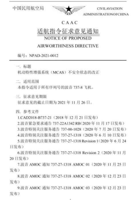 《通知》表示,为了解决上述不安全状态,波音启动了飞行控制系统软件和显示系统软件的设计更改工作,中国民航局在对波音提交的飞行控制系统软件设计更改、显示系统设计更改、飞机飞行手册修订、水平安定面配平线束敷设改装等相关改正措施开展了全面的评估后,确认相关改正措施能消除上述不安全状态。征求意见的截止时间为2021年11月26日。