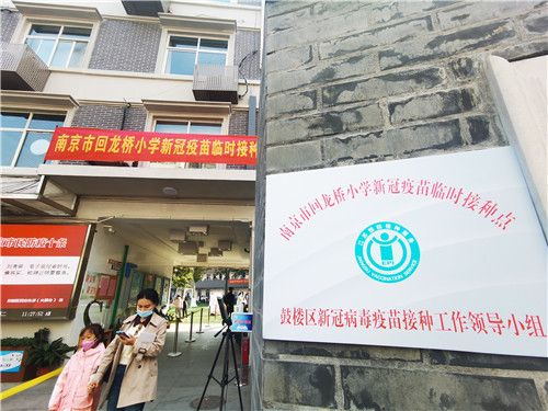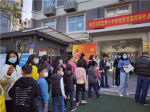 2021年11月16日,南京市鼓楼区新冠肺炎疫苗接种工作领导小组在南京市回龙桥小学设置的新冠疫苗临时接种点,家长、老师带着孩子们接种新冠疫苗。