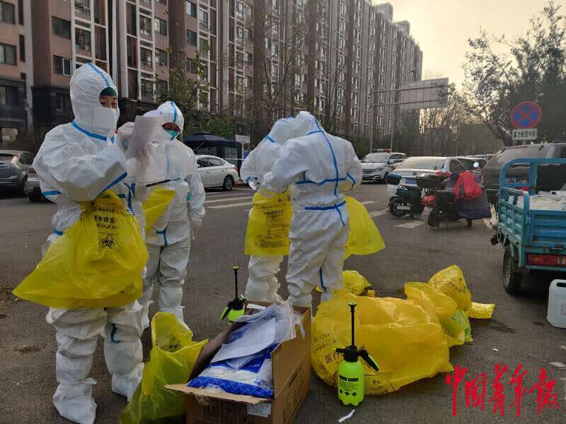 11月15日,富力桃园社区外,医务人员即将对社区密接和次密接人员进行核酸检测。中青报·中青网记者 张艺/摄