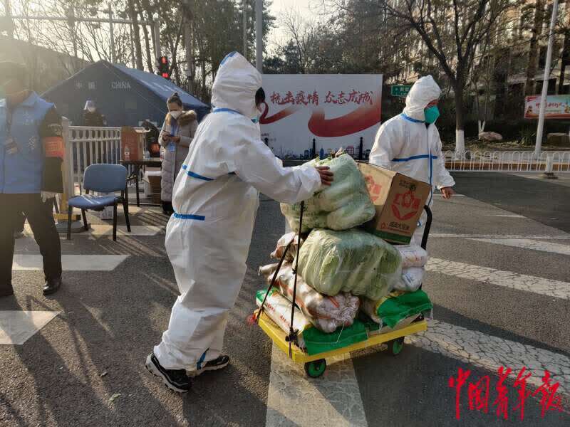 11月15日,工作人员正在用小推车运送米、油、大白菜等。 中青报·中青网记者 张艺/摄