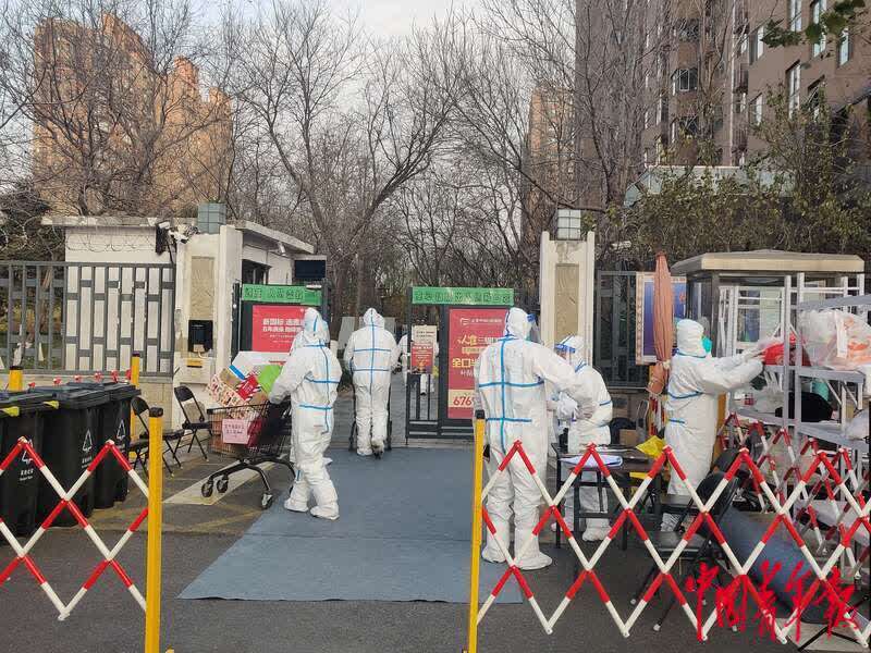 11月15日,富力桃园C区门口,工作人员正在把生活物资送进小区。 中青报·中青网记者 张艺/摄