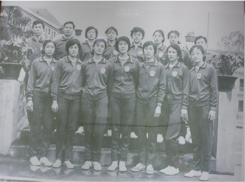 1979年中国女排首次集训郴州。前排左起:梁艳、周鹿敏、周晓兰、郎平、陈亚琼、曹艳英、杨希。后排左起:袁伟民、邓若曾、郑美珠、陈招娣、孙晋芳、张洁云、张蓉芳、张一沛。