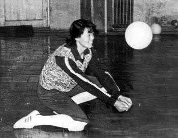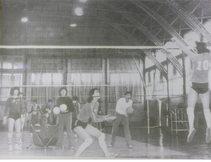 1980年副攻周晓兰(右)苦练,孙晋芳传球。