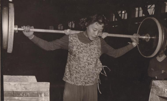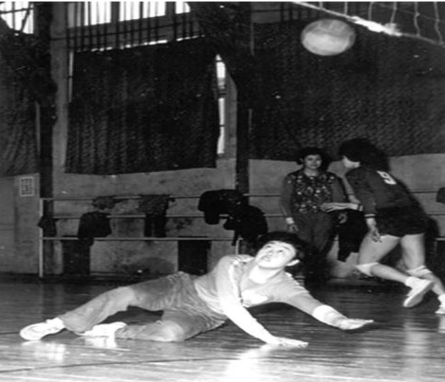接应二传陈招娣在竹棚训练馆练习救球。因地板不光滑,木刺经常刮破皮肤和球衣,基地家属利用窗帘布为每个队员缝制了两件花背心。