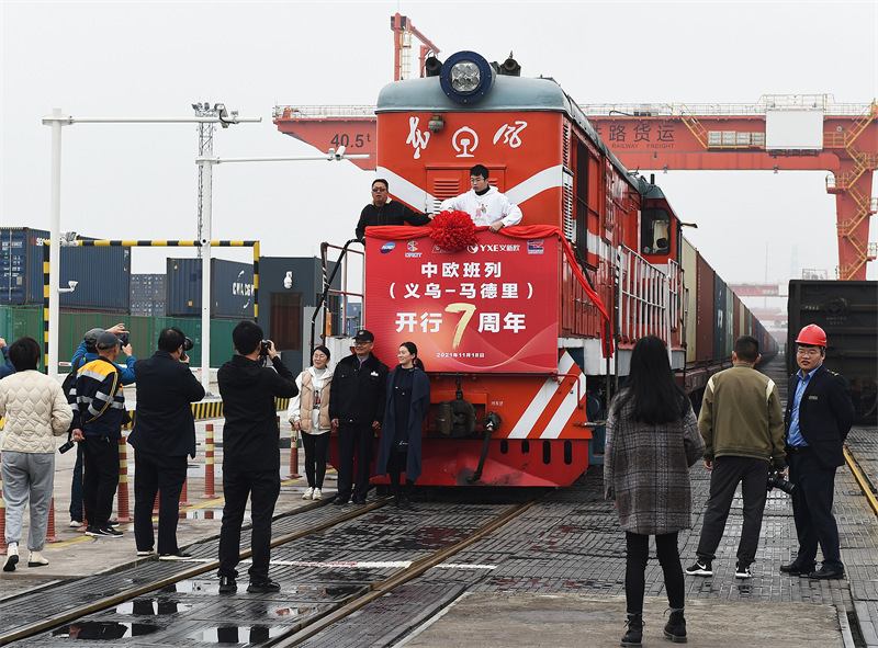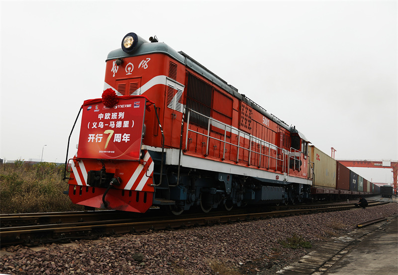 2021年11月18日,浙江金华,第X8020次“义新欧”中欧班列从铁路义乌西站启程,驶向西班牙马德里。