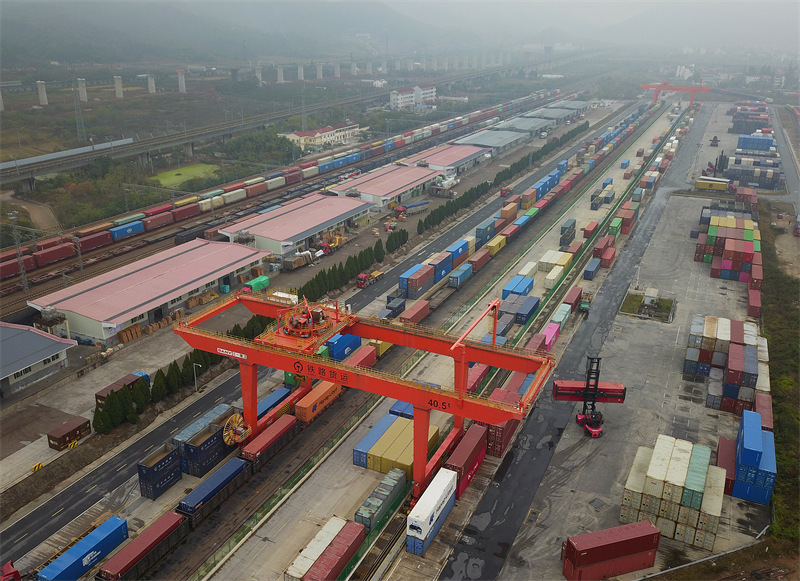 2021年11月18日,浙江金华,铁路义乌西站,工人正在往“义新欧”中欧班列上装载集装箱。