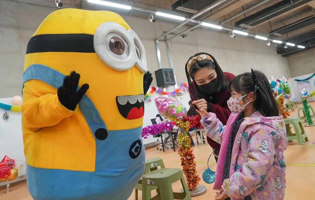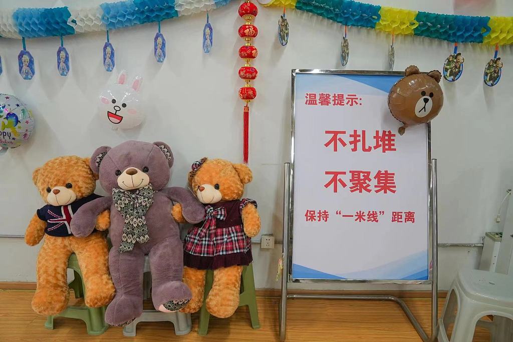 2021年11月17日,北京,南法信镇疫苗接种点,这里就像个儿童乐园,走过五彩气球门后,四周墙壁被造型各异的彩色气球和拉花装饰,就连指引隔离带都变成彩色的。十余个信息登记台相隔分布,家长们带着孩子们有序排队登记信息。孩子们不哭不闹,好奇地看着走来走去的小熊玩偶。