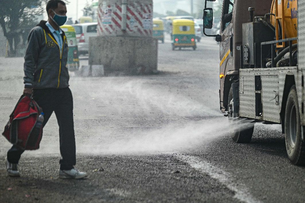11月12日,新德里,市政公司的清洁车在道路上洒水降尘。
