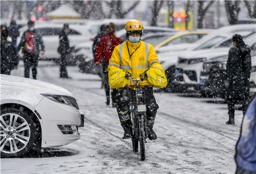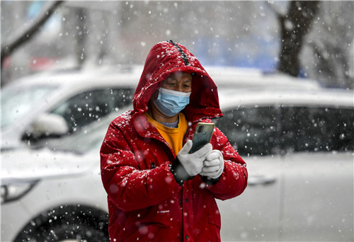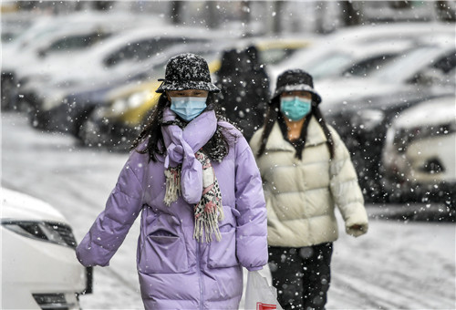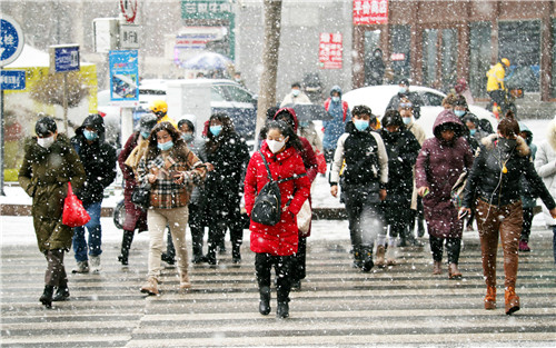 2021年11月18日,乌鲁木齐迎来降雪天气,市民冒雪出行。