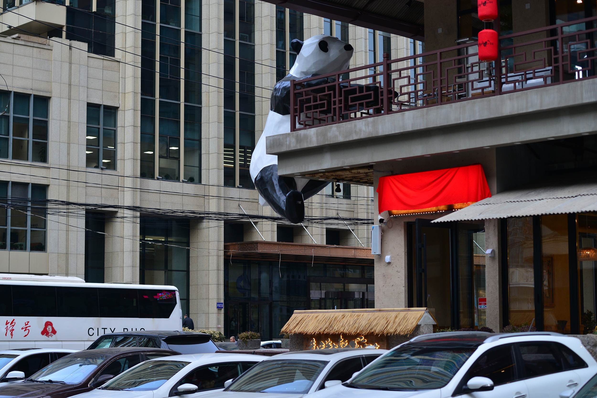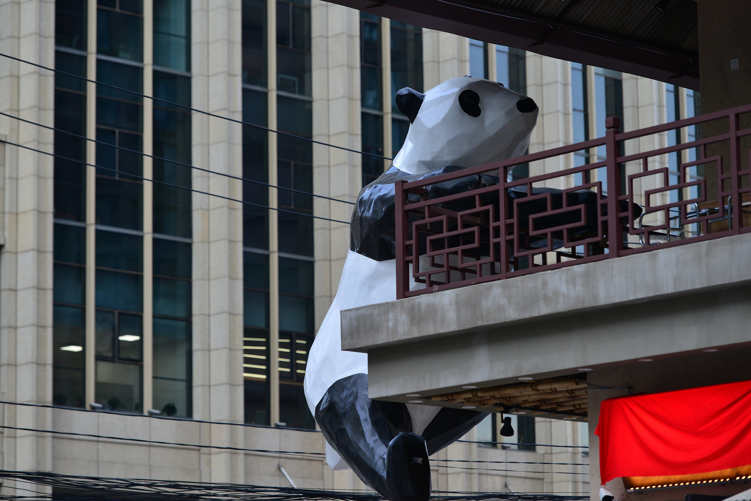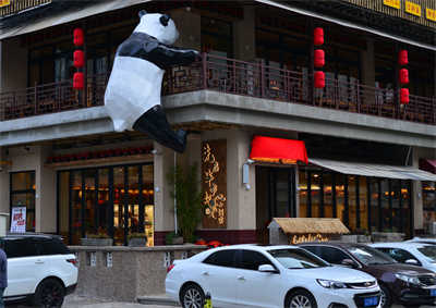 2021年11月19日,沈阳一餐馆外墙现攀爬大熊猫,呆萌可爱格外吸睛。