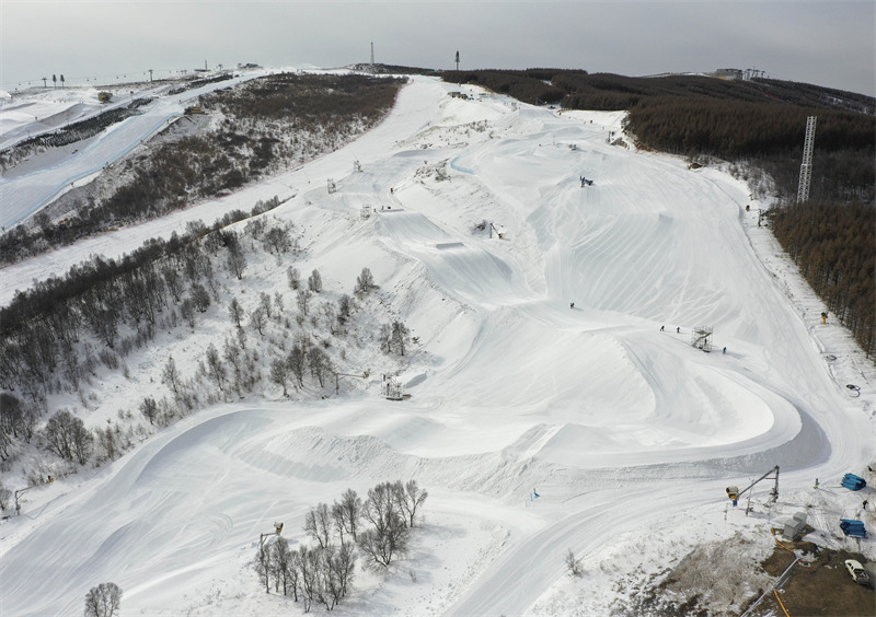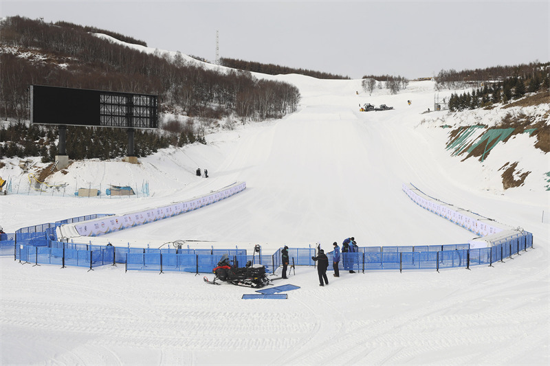 2021年11月20日,河北张家口,工作人员在云顶滑雪公园赛道进行滑雪巡线。