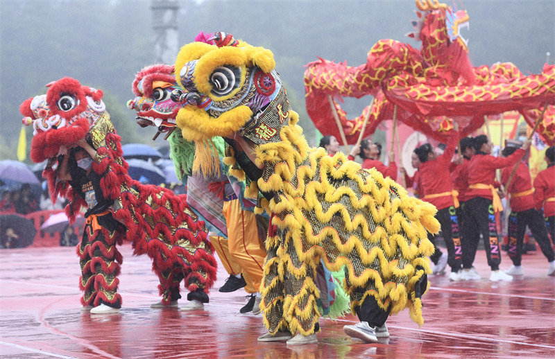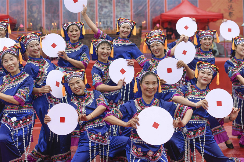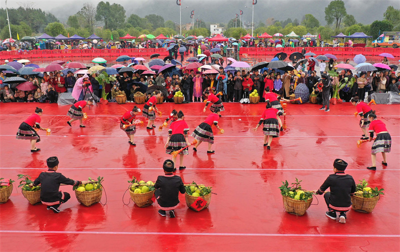 2021年11月20日,湖南省永州市,江永县千家峒瑶族乡盘王广场,瑶族同胞载歌载舞庆祝盘王节。