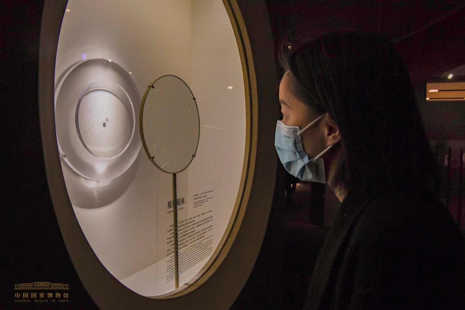 观众在观看炭化稻米。稻米距今约11000-8500年,2006年出土于上山遗址。余冠辰/摄