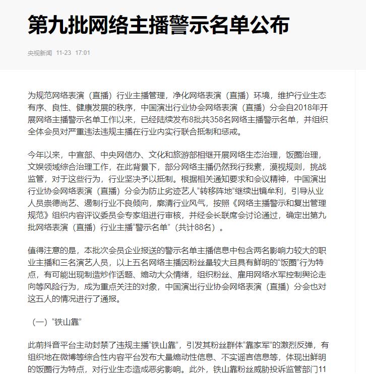 【违法失德艺人首次纳入网络主播警示名单 吴亦凡郑爽张哲瀚被封禁】中国演出行业协会网络表演(直播)分会23日发布第九批网络主播警示名单,包括“铁山靠”“郭老师”两名职业主播和“吴亦凡”“郑爽”“张哲瀚”三名演员在内的88名主播将在行业内被实行联合抵制和惩戒。这是违法失德艺人首次被纳入网络主播警示名单中,防止劣迹艺人转移阵地复出。名单向社会公布后将下发各平台予以封禁,并同步报主管部门备案。