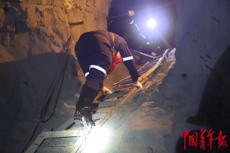 明查暗访组专家从运输平硐爬上了回风天井进行检查。