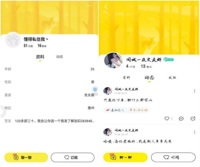 在小鹿陪玩平台上,有网友在自己的签名上写下“120多部三十”的字样,以相对隐晦的方式出售涉黄视频,也有以“同城一夜交友群”为名,表示“只要你下单,聊什么都可以”,还有“可以空降”“一单一张黑丝的姐姐来”等内容。