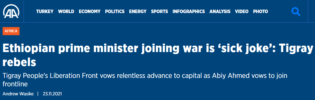 另一方面,据土耳其阿纳多卢通讯社(Anadolu Agency)等报道,TPLF对于现任总理要亲临前线的表态嗤之以鼻,形容是一个“病态的笑话”(sick joke)。