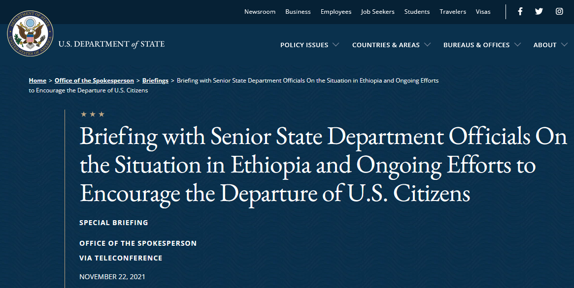 另据美国国务院官网消息,当地时间11月22日,就当前埃塞俄比亚局势,两名美国国务院高级官员出席了一场简报会,其中所透露的信息,似乎预示着局势将进一步恶化。